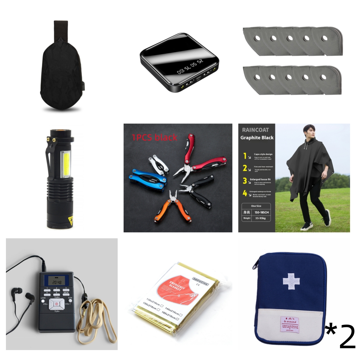 Sports Bag * 1+Power Bank * 1+Dust mask*1+Flashlight * 1+Pliers *1+Raincoat*1+1*Mini Radio Player+Portable first aid kit*2+1* Survival blanket